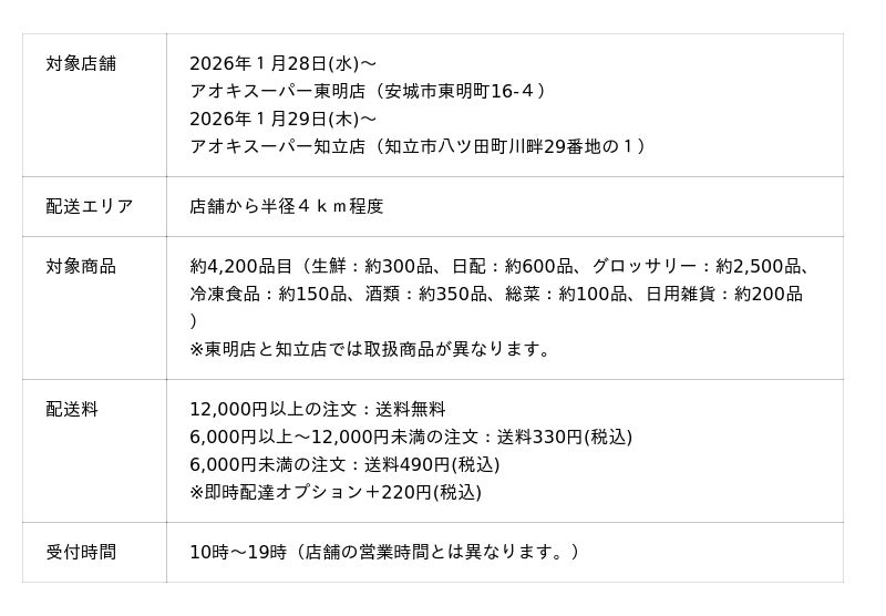 株式会社アオキスーパーは、多様化するライフスタイルに対応するため、ONIGO株式会社(以下、ONIGO)が提供する即時配達サービスを三河エリアに拡大します。三河エリアでは、東明店(安城市)・知立店(知立市)を拠点にサービスを開始し、これにより安城市、知立市、刈谷市、豊田市、岡崎市の一部が配達エリアに加わります。