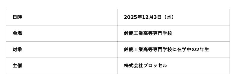 高専生を対象にしたキャリアパートナー事業を展開する株式会社プロッセル(本社:新潟県新潟市、代表取締役CEO:横山和輝、以下「プロッセル」)は、2025年12月3日(水)に鈴鹿工業高等専門学校にて、在学中の2年生に対するキャリア講演を実施いたしました。講演には長岡高専出身の当社代表の横山と、久留米高専出身のSocialups株式会社 代表取締役社長/CEOの高瀬 章充氏が登壇いたしました。地方に点在し多様なロールモデルとの接点が限られがちな高専生に対し、自身の波乱に富んだキャリアの裏側や、高専時代の失敗をどう乗り越え現在のキャリアに繋げたのかなど、包み隠さず語りました。当社は今後も高専生に対するキャリア教育を通じて、ビジョン「高専人を幸せに。そしてその周りの人へ。」の実現を目指してまいります。
