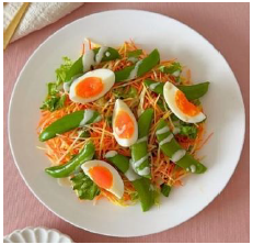 1. スナップえんどうは筋をとり、塩を加えた熱湯でゆで、水にとり水気を切る。ゆで卵は縦4等分に切る。