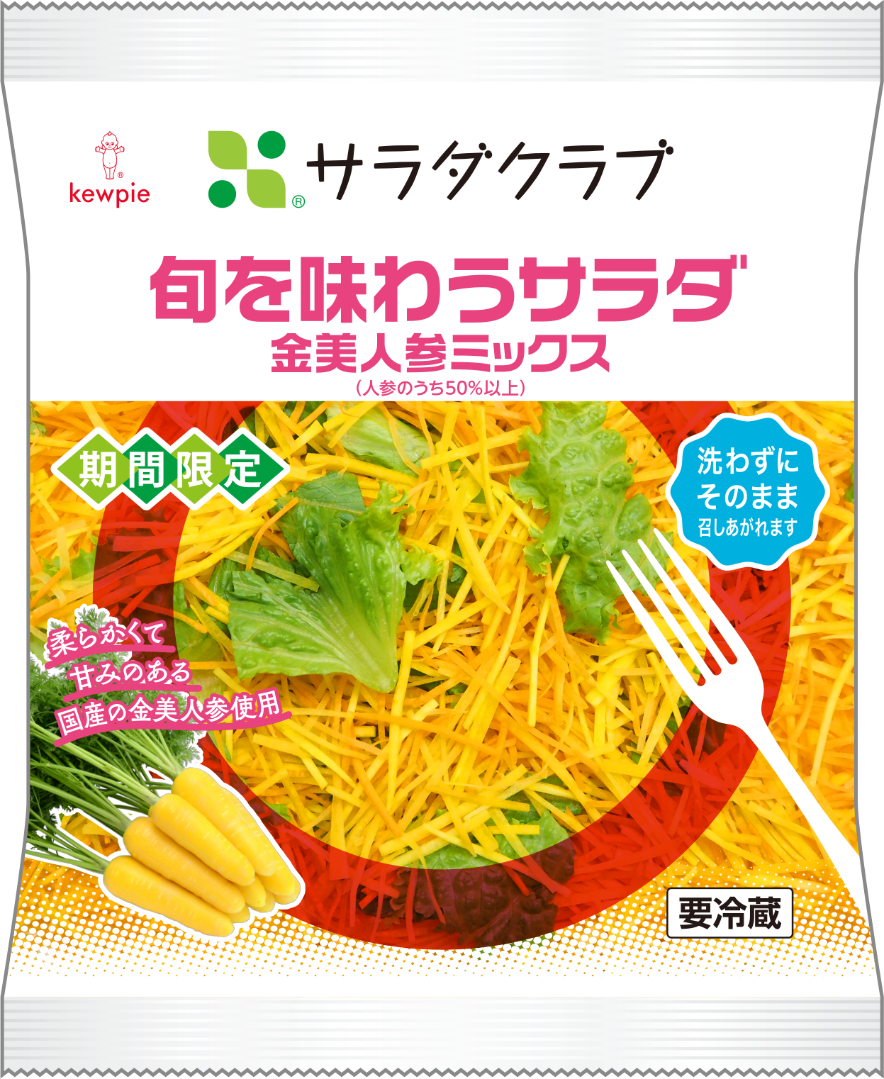 「旬を味わうサラダ ミックス」は、季節を感じられる野菜を使用した「旬を味わうサラダ」シリーズの期間限定商品です。本商品は、配合野菜の約8割が人参で構成されており、そのうちの半分以上に、冬から春に旬を迎える国産の“金美人参”を使用しています。金美人参は、通常の人参よりも甘みが強く、肉質もやわらかいので生食にぴったりな食材です。通常の人参と比べ匂いのクセも少なく、野菜が苦手なお子さまにもおすすめです。鮮やかな黄色が特長で、食卓を華やかに彩ります。