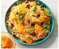 2. お皿に「旬を味わうサラダ 金美人参ミックス」を盛りつけ、1.のみかん、レーズンをのせる。