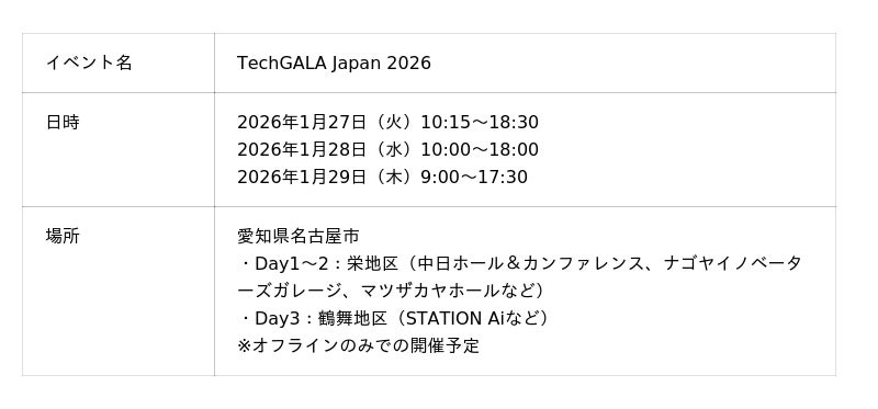 「TechGALA Japan 2026」を2026年1月27日(火)から29日(木)にかけて、愛知県名古屋市でにて本日より開催いたします!
