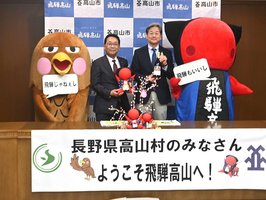 口癖「飛騨じゃねぇし」で知られる長野県高山村の信州高山村観光協会のキャラクター「高山タカオ」(通称タカオ君)。岐阜県高山市の田中明市長がSNSでタカオ君について触れたことがきっかけに交流が始まり、26日に藤沢敏和村長がタカオ君と共に市役所を訪れ、交流を図った。