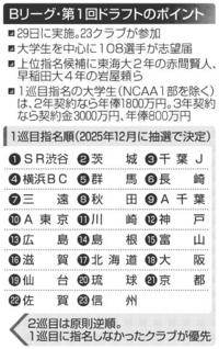 バスケBリーグあす初ドラフト 戦力を均衡化活性化へ布石 108選手が志望届 県関係は2人 2026年1月28日 05:00 昨年12月に行われたバスケットボール「Bリーグ・プレミア」の第1回新人ドラフトの指名順抽選。右は島田慎二チェアマン=東京都内 バスケットボールBリーグのドラフ... 残り1218文字(全文:1235文字) この記事をお読みいただくには「デジタルプラン」または「宅配+デジタルプラン」の会員登録が必要です。無料会員の方はログインしてマイページからコース変更してください。デジタルプランまたは宅配+デジタルプランをご登録中の方はログインしてください。 岐阜新聞デジタル会員に登録すると 無料会員向け記事が読める ニュースレターで最新情報が受け取れる デジタルプラン、宅配+デジタルプランなら Webオリジナルコンテンツが読める 紙面ビューアが読める チケットの先行発売に参加できる お得なクーポンが使える 新規登録ページ ログインページ トップ 岐阜のニュース バスケBリーグあす初ドラフト 戦力を均衡化活性化へ布石 108選手が志望届 県関係は2人 関連記事 衆院選、岐阜県内20候補の第一声AI分析 際立つ「高市」 衆院選公示「岐阜に活力」実現私が 真冬の決戦、候補者熱く テニス 全豪オープン サバレンカ4強 テニス 川西・渡辺組 準々決勝進出 ジュニア きょうのスポーツ ◇卓球 新日本スポーツ連盟第11回東海オープン県個人リーグ戦 おすすめ記事 衆院選、岐阜県内20候補の第一声AI分析 際立つ「高市」 衆院選公示、苦しい生活…本気で取り組んで 岐阜県民ら切実、注目する政策は 「高山市も割といいじゃん」上から目線…でも憎めないタカオ君、岐阜訪問 名鉄「竹鼻・羽島線」の運行本数見直し 3月にダイヤ改正、犬山線も