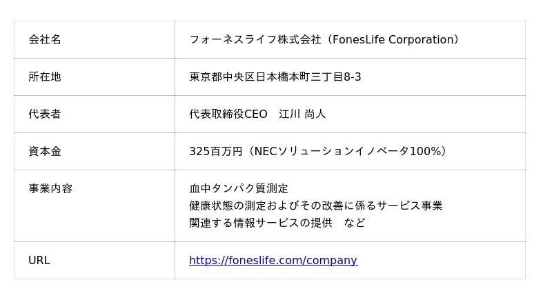 フォーネスライフは、デジタル技術でヘルスケア領域にソリューションを提供するNECソリューションイノベータが100%出資する会社です。米国Standard BioTools(TM)社の血中タンパク質測定技術と、NECグループのビッグデータ解析・先端ICTを用い、認知症などの将来の疾病リスク予測に基づく、一人ひとりに適した生活習慣の改善提案を行うことで、“誰も病気にならない未来”、“誰もが自分らしく生きられる社会”の実現を目指しています。