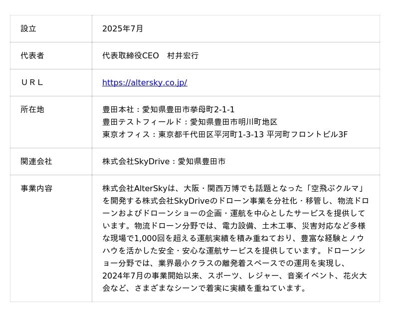 今後もAlterSkyは、国内外のパートナーや関係機関と連携しながら、安全性と実現性を重視した取り組みを通じて、ドローン事業の発展に貢献してまいります。
