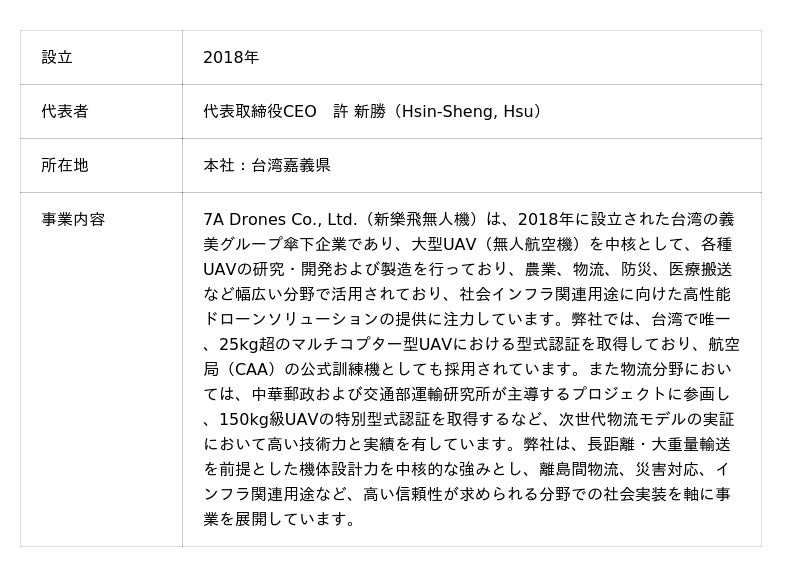 ≪7A Drones Co., Ltd.(新楽飛無人機) 概要≫