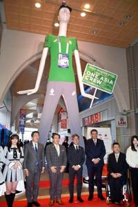 10月に開催される愛知・名古屋アジアパラ大会のボランティアのユニホーム発表会が28日、名古屋駅前で行われ、待ち合わせスポットとして有名な巨大マネキン「ナナちゃん」が特別サイズのユニホームを着てPRした。