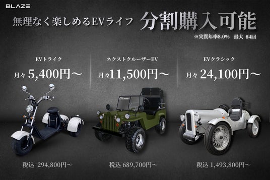 株式会社ブレイズ(愛知県名古屋市、代表取締役:市川秀幸、以下ブレイズ)は、レジャー志向の高付加価値モデルである3輪電動ミニカー「EVトライク」、4輪電動ミニカー「ネクストクルーザーEV」、「EVクラシック」において、導入しやすい分割払いプランをご案内しています。