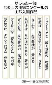 「ミャクミャクと 続く気配の 物価高」―。第一生命保険は29日、「サラっと一句!わたしの川柳コンクール」の2025年の入選作100句を発表した。生活を苦しめる物価高と、話題を集めた大阪・関西万博の公式キャラクターといった世相を結び付けるなど、機知に富んだ句が集まった。