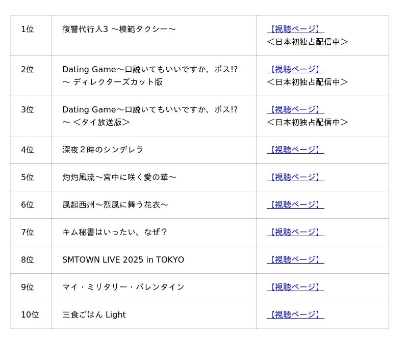 NTTドコモの映像配信サービス「Lemino(R)」は、2025年12月の韓流・アジアコンテンツの月間視聴数を集計し、「Lemino人気作品月間ランキング」を発表いたします。12月は、”模範タクシー”に乗る秘密のプロフェッショナル集団が弱者に代わって法では裁けない悪に復讐するアクションエンターテインメント『復讐代行人3 ~模範タクシー~』が2ヶ月連続で1位にランクインしました。
