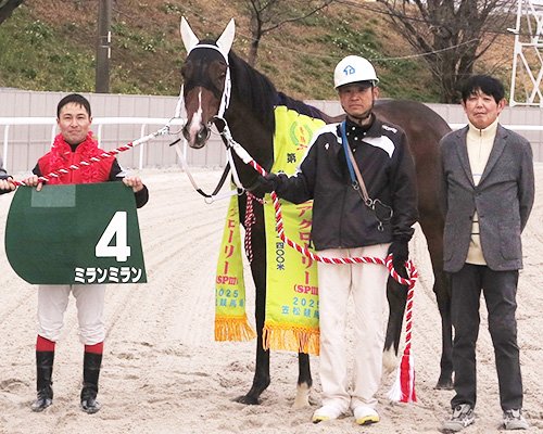 ジュニアグローリーを制覇したミランミランと筒井騎手、田口調教師ら