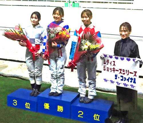 LJSザ・ファイナルの表彰式。深沢杏花騎手が総合2位で待望の表彰台に上がった。1位は小笠原羚騎手、3位は佐々木世麗騎手