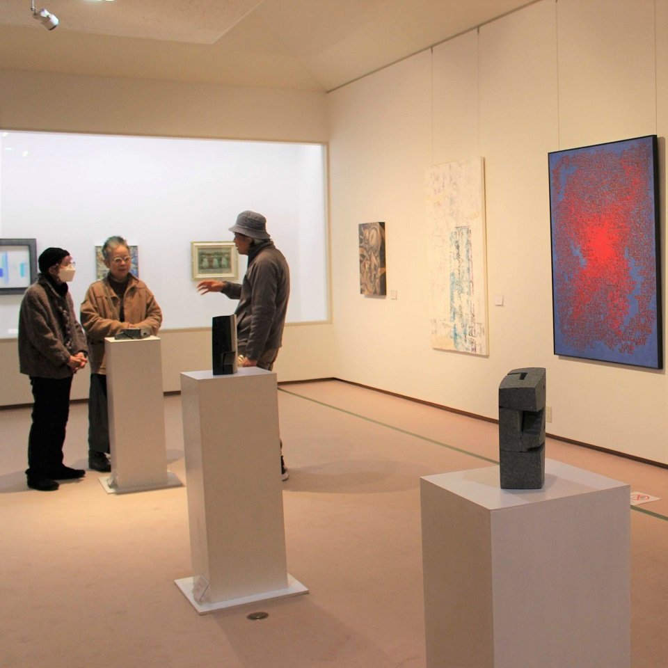県内の芸術家でつくる「萠土(ほうど)社」の第55回萠土展が、岐阜市大宮町の加藤栄三・東一記念美術館で開かれている。それぞれのテーマを追求した創造力あふれる絵画や彫刻29点が並ぶ。3月1日まで。