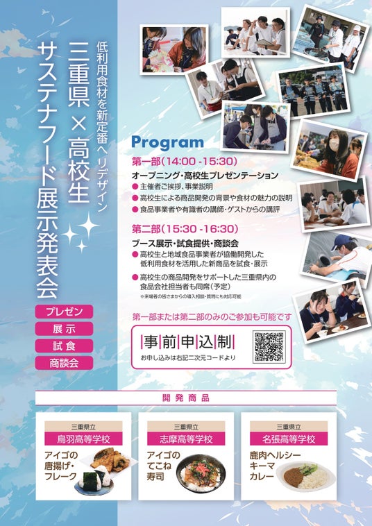 本イベントでは、三重県立鳥羽高校・志摩高校・名張高校の生徒たちが、自ら商品のプレゼンテーションを行い、首都圏の食品バイヤーやメーカーに向けて、試食を交えながら商品そのものの魅力に加え、背景にある地域課題や開発ストーリーを発信します。