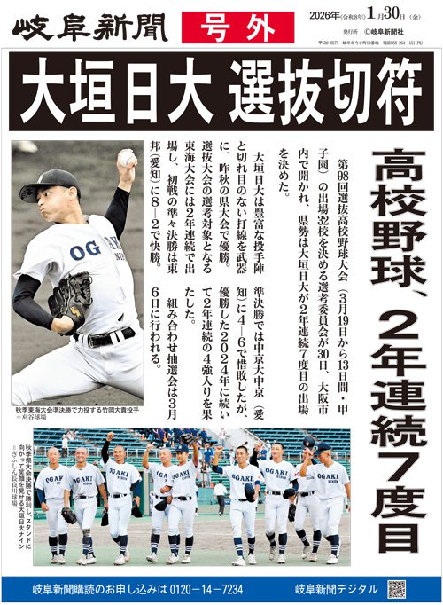 【号外】大垣日大 選抜切符 高校野球、2年連続7度目 号外 2026年1月30日 16:03 PDFデータダウンロード トップ 岐阜のニュース 号外 【号外】大垣日大 選抜切符 高校野球、2年連続7度目 関連記事 【号外】新首相に高市氏 初の女性、自維政権発足へ 【号外】公明、連立離脱 政治とカネで自民と溝 【号外】自民総裁に高市氏 決選投票で小泉氏破る 【号外】石破首相、辞意 総裁選前倒し要求拡大 【号外】中京4連覇 全国高校軟式野球、史上初 【号外】県岐阜商、甲子園へ 帝京大可児破り3年ぶり 第107回全国高校野球岐阜大会決勝 おすすめ記事 【森嶋ルポ】進化の鍵は「スピード」 大垣日大2年連続センバツ決定 高橋監督率いる新生強豪、甲子園初勝利へ【ぎふ高校野球】 【号外】大垣日大 選抜切符 高校野球、2年連続7度目 養老町の7小学校再編、協議開始へ 準備委が初会合 クマの緊急銃猟、東濃で初の実地訓練 中津川市や地元猟友会、冬眠明けに備え