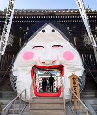2月3日の節分を控え、博多祇園山笠が奉納されることで知られる福岡市博多区の櫛田神社に、毎年恒例の「大お多福面」が登場し、参拝客の目を楽しませている。大きく開いた口をくぐると、商売繁盛や家内安全といった御利益があるとされる。15日まで。