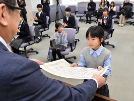 岐阜県内の小中学生が制作した新聞作品の出来栄えを競う「第10回かべ新聞コンクール」の表彰式が31日、岐阜新聞本社で開かれ、入賞の児童生徒に、矢島薫社長らから賞状が贈られた。