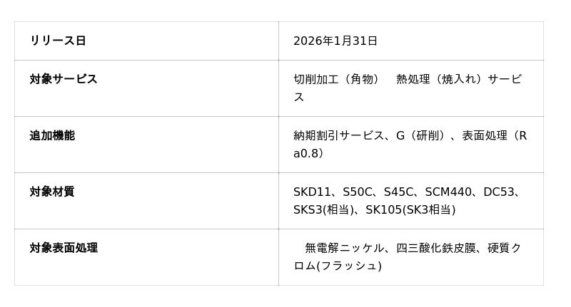 機械部品調達のAIプラットフォーム「meviy(メビー)」(サービス提供元:株式会社ミスミグループ本社)は、2026年1月31日より、切削加工(角物) (以下、切削角物)における熱処理(焼入れ)サービス(以下、熱処理)を拡大しました。今回のアップデートでは、設計者のニーズに応え、焼入れ部品でこれまで対応が難しかった曲面などを含む複雑形状の加工や研削加工への対応により、表面粗さRa0.8の指定も可能となりました。さらに、納期割引サービスにも対応し、長納期を選択いただくことで通常価格より30%OFFとなり、高価になりがちな焼入れ部品をより手軽な価格で調達いただけます。