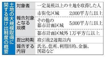 国交省によると、大規模な土地の購入者は国土利用計画法により、取引後2週間以内に利用目的や金額などを地方自治体に報告することが義務付けられている。25年7月から、個人が取得した場合、国籍を届け出る義務が課された。