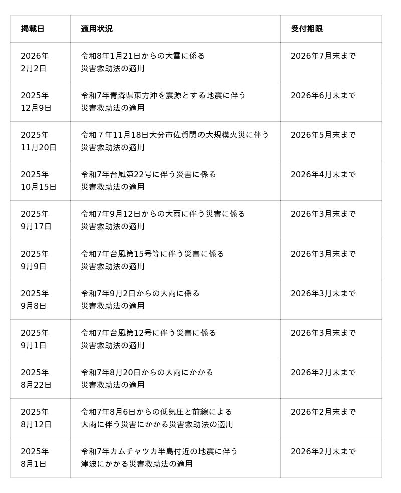 ※災害救助法適用地域の最新情報は内閣府のホームページにてご確認ください。