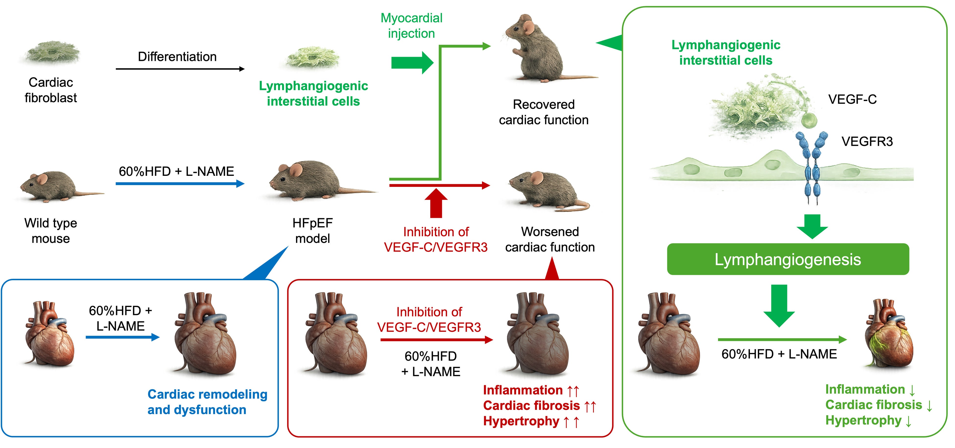 HFpEFモデル(高脂肪食とL-NAMEで誘導したモデル)では、心臓リンパ管の減少に伴い、炎症、線維化、心筋肥大が進行し、心機能が低下することが明らかとなった。さらに、VEGF-C/VEGFR3シグナルを介したリンパ管新生を薬理学的に阻害すると、HFpEFの病態は一層悪化することが分かった。次に、心臓線維芽細胞を既報の方法によりリンパ管新生型間質細胞(VCF)へと分化させ、HFpEFモデル心臓に移植すると、VCFはVEGF-Cを分泌し、VEGF-C/VEGFR3経路を介してHFpEFモデルの心臓内でリンパ管新生を促進した。その結果、HFpEFに伴う炎症、線維化、心筋肥大が抑制され、拡張機能障害が改善した。これらの結果から、HFpEFはVEGF-C依存的なリンパ管機能によって病態が規定される疾患であり、治療的リンパ管新生が有効な治療介入となり得ることが示された。