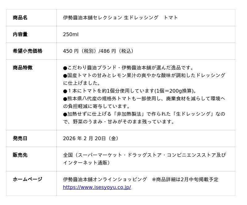 総合食品メーカー、ヤマモリ株式会社(本社:三重県桑名市、社長:三林 圭介)は、2025年に発売した「伊勢醤油本舗セレクション 生ドレッシング」シリーズの新アイテムとして「トマト」を2026年2月20日(金)より新発売します。