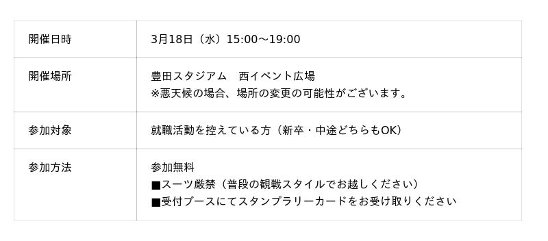 標記の件、3月18日(水)サンフレッチェ広島戦にて2年連続2回目となる”スーツ厳禁“の就活イベントを開催する運びとなりましたので、お知らせいたします。