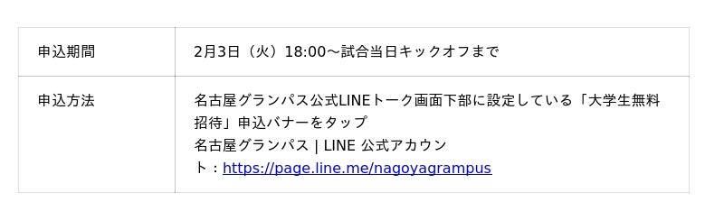 また、当日は「大学生無料招待」を実施します。名古屋グランパスは、一人でも多くの学生の皆さまにお越しいただき、普段の応援スタイルや好みのスタイルで自然体のままイベントにご参加いただき、パートナー企業と就職活動を控える皆さまとの素敵な出会いのきっかけとなり、架け橋となることを願っております。多くの学生の皆さまのご参加お待ちしております!