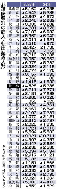 岐阜転出超過4528人 25年移動報告 東京は転入超過6万5219人 40道府県で人口流出 2026年2月4日 05:00 総務省が3日発表した2025年の... 残り815文字(全文:832文字) この記事をお読みいただくには「デジタルプラン」または「宅配+デジタルプラン」の会員登録が必要です。無料会員の方はログインしてマイページからコース変更してください。デジタルプランまたは宅配+デジタルプランをご登録中の方はログインしてください。 岐阜新聞デジタル会員に登録すると 無料会員向け記事が読める ニュースレターで最新情報が受け取れる デジタルプラン、宅配+デジタルプランなら Webオリジナルコンテンツが読める 紙面ビューアが読める チケットの先行発売に参加できる お得なクーポンが使える 新規登録ページ ログインページ トップ 岐阜のニュース 岐阜転出超過4528人 25年移動報告 東京は転入超過6万5219人 40道府県で人口流出 関連記事 ぎふ衆院選2026 公約 若者に恩恵は? 岐阜大生、候補者の主張を分析 堺市の住宅に溺死体 78歳女性 首など骨折、殺人か 学童クラブでわいせつ疑い 警視庁、保育士逮捕 マネロン役か 邦人を再逮捕 カンボジア拠点詐欺 仮想通貨でマネロンか 県警など 「相対屋」6人逮捕 詐欺疑い 教団解散命令 来月4日判断 東京高裁 おすすめ記事 CoIUってなんやねん!? 飛騨発「謎大学」が日本の地方を変える! 寒暖差の大きい立春…海津市で早咲きの桜が開花 高山市でダイヤモンドダスト観測 氷点下18.5度、今季最低 かべ新聞コンクール、岐阜県図書館で入賞作品を展示