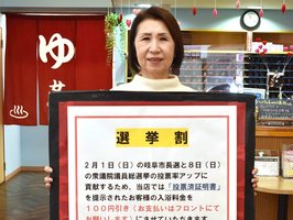 温浴施設で選挙割 岐阜ふじの湯、衆院選や岐阜市長選対象 ライフスタイル レジャー 2026年2月4日 08:48 選挙割をPRする鈴木貴代美さん=岐阜市正木、アクアリゾート岐阜ふじの湯 8日投開票の衆院選に合わせ、岐阜市正木の温浴施設アクアリゾート岐阜ふじの湯では「選挙割」を行っている。投票済証明書を... 全文:309文字 この記事をお読みいただくには「デジタルプラン」または「宅配+デジタルプラン」の会員登録が必要です。無料会員の方はログインしてマイページからコース変更してください。デジタルプランまたは宅配+デジタルプランをご登録中の方はログインしてください。 岐阜新聞デジタル会員に登録すると 無料会員向け記事が読める ニュースレターで最新情報が受け取れる デジタルプラン、宅配+デジタルプランなら Webオリジナルコンテンツが読める 紙面ビューアが読める チケットの先行発売に参加できる お得なクーポンが使える 新規登録ページ ログインページ トップ 岐阜のニュース ライフスタイル 温浴施設で選挙割 岐阜ふじの湯、衆院選や岐阜市長選対象 関連記事 赤鬼が豪快ダイブ、厄落とし 岐阜市の玉性院「つり込み祭り」 音楽、クイズで「飛騨好き」に 高校生有志「MAP’07」3月に高山市で催し ココイチ創業者、宗次さん講演 「人に喜ばれる人生が楽しい」 岐阜市 経営理念や歩みを振り返る 雄大な山の風景切り取る 日本山岳会支部が写真展 岐阜市 名鉄高架化「2027年度に一部着工」 岐阜市長選3選、柴橋さん会見 かまくら、明かり幻想的 高山市で中尾かまくらまつり おすすめ記事 長距離運送、運転手が他社トラックに乗り換え 西濃運輸が国内初、中継輸送実証運行 豪雪地帯の岐阜4区「雪も敵」短時間の演説余儀なく 除雪間に合わず掲示板の設置も半数に 衆院選投開票日、岐阜県内雪の可能性 期日前投票の活用を イビデンが総額5000億円設備投資、過去最大規模 大垣市の工場棟増強