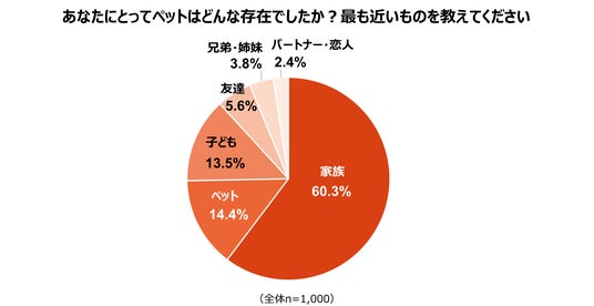 あなたにとってペットはどんな存在でしたかという問いに対しては、「家族」と回答した飼育者が60.3%で最多となりました。次いで「ペット」が14.4%、「子ども」が13.5%と続きました。「家族」(60.3%)「子ども」(13.5%)「兄弟・姉妹」(3.8%)など、ペットを人間と同等の家族として捉えている回答を合わせると約8割にのぼる結果となりました。