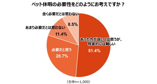 ペット休暇の必要性については、「あった方が良いとは思うが、現実的には難しい」が51.4%で過半数を占めました。これに「必要だと思う」(28.7%)を合わせると、約8割がペット休暇の必要性を感じています。しかし、現実的な運用には難しさを感じている飼育者が多いことが分かりました。