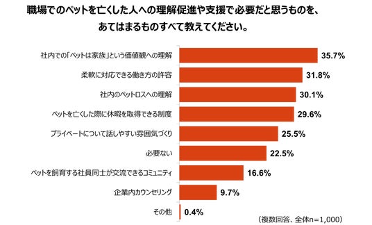 職場でペットを亡くした人への理解促進や支援で必要だと思うものについては、「社内での『ペットは家族』という価値観への理解」が35.7%で最多でした。次いで「柔軟に対応できる働き方の許容」(31.8%)、「社内のペットロスへの理解」(30.1%)、「ペットを亡くした際に休暇を取得できる制度」(29.6%)が続き、制度の導入だけでなく、職場全体の意識や風土に関する項目が上位に挙がりました。