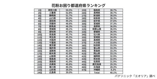 一方、下位は46位 北海道(28.3%)、47位 沖縄県(8.2%)と、いずれも避粉地として知られる地域が最下位となりました。