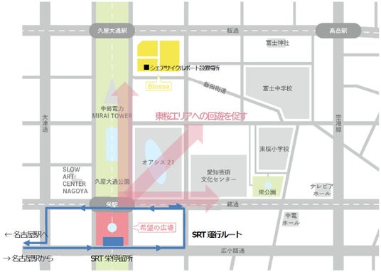 本社会実験は、名古屋市が都心における回遊性向上や賑わい拡大を目的として導入する、新たな路面公共交通システム「SRT」の運行開始を契機とし、SRTの乗車体験とまちへの回遊を連続的に楽しめる環境づくりをめざすものです。SRT栄停留所が設置される久屋大通公園「希望の広場」(名古屋市中区錦3丁目)では、滞留空間の整備に加え、情報発信や賑わい創出イベントなどを開催します。
