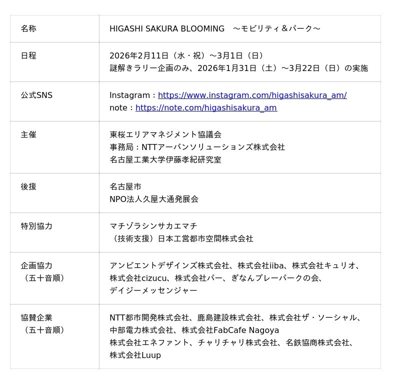 東桜エリアマネジメント協議会(事務局:NTTアーバンソリューションズ株式会社(本社:東京都千代田区、代表取締役社長 池田 康)、以下「当団体」)は、東桜エリアへの回遊促進を目的とした社会実験『HIGASHI SAKURA BLOOMING ~モビリティ&パーク~』を、2026年2月11日(水・祝)~3月1日(日)の19日間で実施します。本社会実験は、名古屋市およびNPO法人久屋大通発展会の後援のもと実施します。