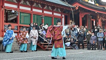 豆まき式では、巫女(みこ)や氏子青年会の会員らが境内高舞殿から豆やお菓子の入った袋を投げ、参拝者たちは寒さに負けず、「鬼は外、福は内」と威勢よく声を上げながら手を伸ばした。...