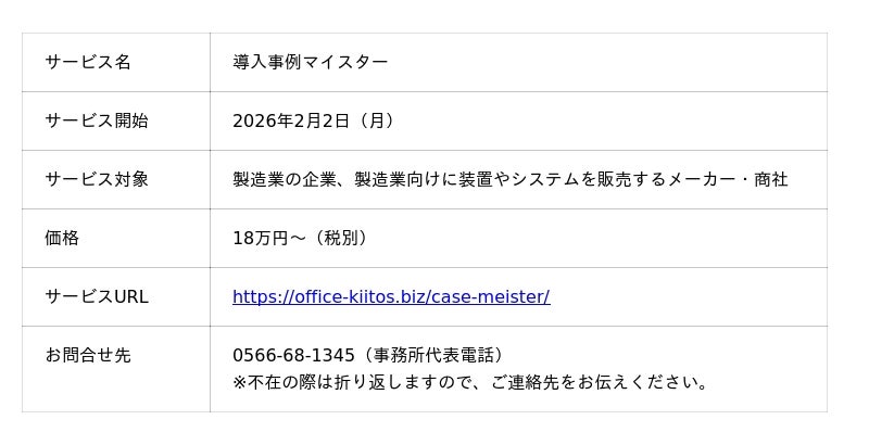 製造業専門のライティング・コンサルティング事業を行うオフィス・キートス(所在地:愛知県安城市三河安城町1-11-1 BESTビル3F-E、代表:新開潤子)は、2026年2月より、製造業向けの装置・システムに特化した導入事例の取材・執筆サービス 「導入事例マイスター」 を開始いたします。