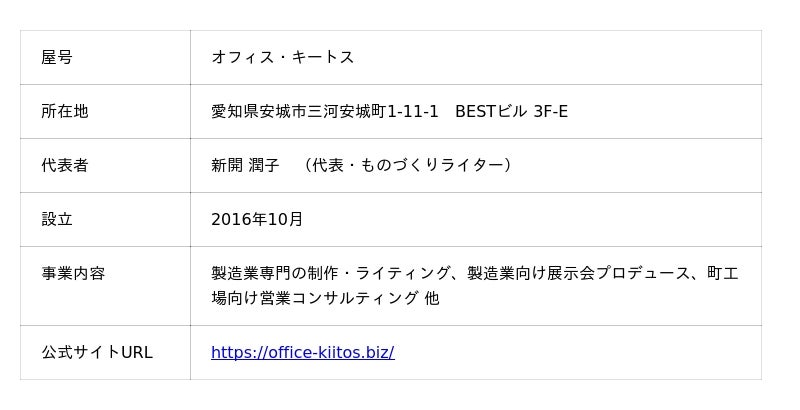 今後は、当オフィスが提供中の展示会出展支援サービス「展示会ブースター」とも連携し、製造業の営業活動の活性化、ひいては日本の製造業全体の活性化を目指して、ライター・コンサルタントの立場から製造業を応援してまいります。(オフィス・キートス 代表 新開潤子)■ サービス概要