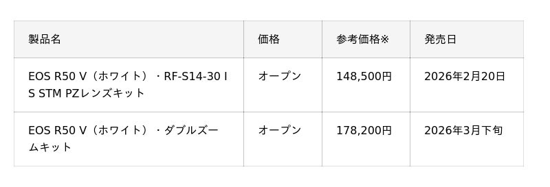 キヤノンマーケティングジャパン株式会社(代表取締役社長:足立正親、以下キヤノンMJ)は、映像表現の幅を広げたい動画クリエイター向けのAPS-Cサイズミラーレスカメラ「EOS R50 V」のカラーバリエーションにホワイトを追加します。”RF-S14-30mm F4-6.3 IS STM PZレンズキット“を2026年2月20日に、「RF-S14-30mm F4-6.3 IS STM PZ」と「RF-S55-210mm F5-7.1 IS STM」がセットになった“ダブルズームキット”を2026年3月下旬に発売します。