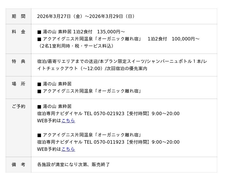 株式会社アクアイグニス(本社:東京都中央区、代表取締役:立花哲也)が運営する、アクアイグニスの別邸「湯の山 素粋居」 及び 複合温泉リゾート施設 アクアイグニス片岡温泉内にある「オーガニック離れ宿」では、毎年春、三重県の鈴鹿サーキットにて開催されるF1日本グランプリの期間にあわせ、国内外から訪れるモータースポーツファンの皆さまへ向けた特別宿泊プランを、2027年3月27日(金)・28日(土)・29日(日)の3日間限定で販売いたします。