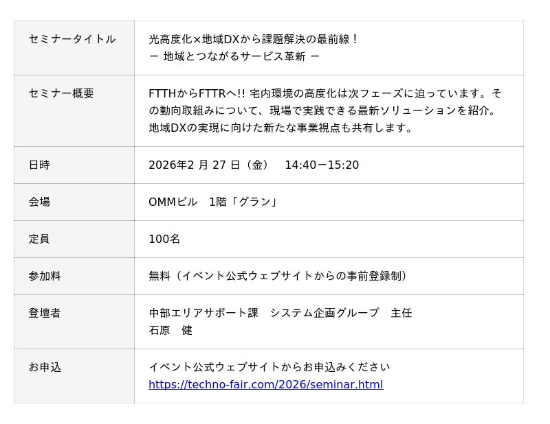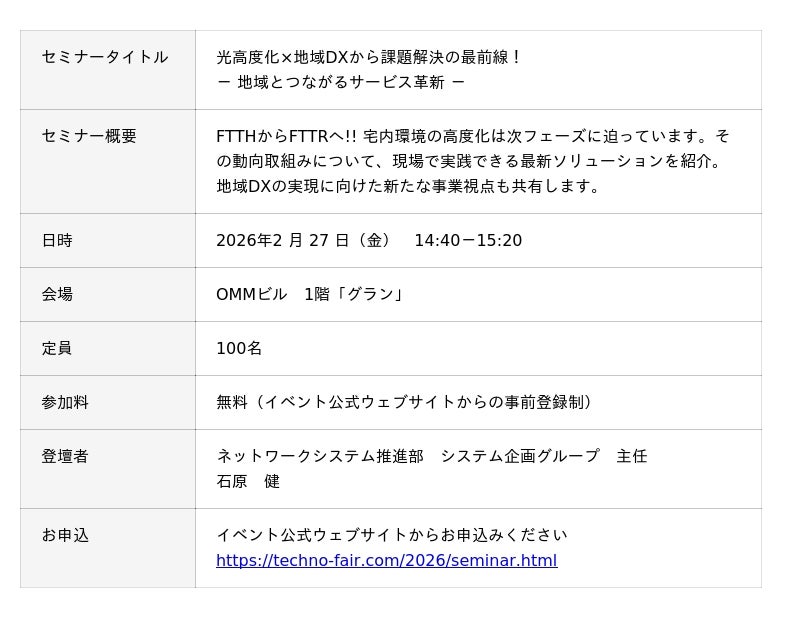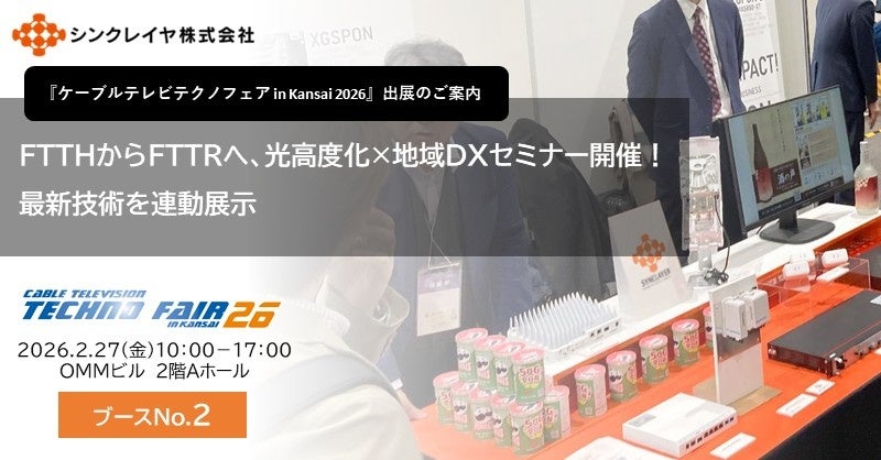 放送・通信に携る事業者のソリューションプロバイダ シンクレイヤ株式会社(東証スタンダード:1724、代表取締役社長:山口 正裕、本社:名古屋市)(以下、当社)は、2026年2月27日(金)大阪市にて開催される『ケーブルテレビテクノフェア in Kansai 2026』(主催:日本ケーブルテレビ連盟近畿支部 技術部会、「ケーブルテレビテクノフェア in Kansai 2026」開催実行委員会)に出展いたします。
