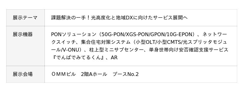 イベントテーマ『地域をもっと豊かに ~ケーブルがつなぐ未来社会~』に沿い、将来の超高速ネットワークに対応し、次世代サービスの基盤となる様々なアイテムをご紹介いたします。国内最速クラスの通信を実現する50G-PONや、これまで光回線が届かなかった地域にも短工期・低コストでサービスを拡大できる柱上型ミニサブセンターを展示し、実際の省スペース性を直接ご確認いただけます。そのほか、Wi-Fiセンシングを用いた単身世帯向け安否確認支援サービス『でんぱでみてるくん』やAR(Augmented Reality:拡張現実)ソリューションをご紹介いたします。
