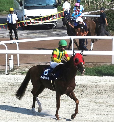 くろゆり賞で返し馬に向かう筒井騎手。後方は深沢騎手