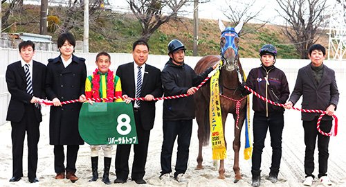 ゴールドジュニアを勝ったリバーサルトップと田口厩舎の厩務員たち