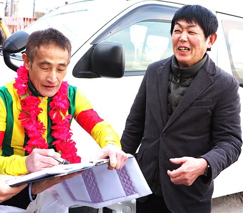 勝利を喜び、にこやかな田口調教師と高木騎手