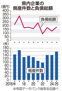帝国データバンク岐阜支店がまとめた県内企業倒産集計(負債額1千万円以上、法的整理)によると、2025年の倒産件数は24年比13・5%増の160件で、16年以降の過去10年では2番目に多い水準となった。原材料や燃料価格の高騰に価格転嫁が追いつかない零細企業や、新型コロナウイルス対策の実質無利子・無担保融資(ゼロゼロ融資)などで過剰な金融債務を抱えた企業の淘汰(とうた)が進んだ。