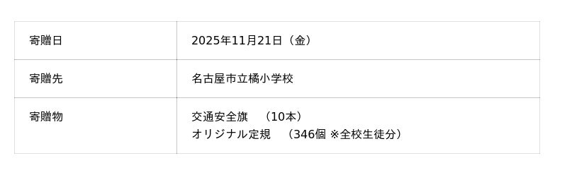 寄贈品は、名古屋市立橘小学校において、交通安全旗は登下校時の見守り活動等で、定規は日常の学習活動の中で活用される予定です。