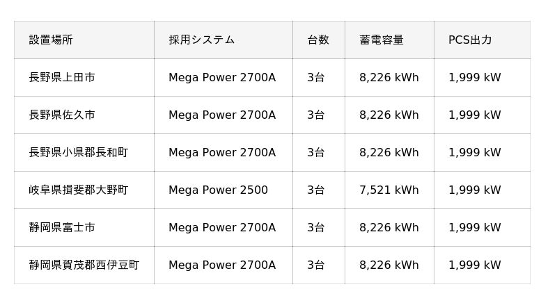 当社システムを採用する蓄電所は長野県・岐阜県・静岡県で整備され、2026年春より順次運転を開始します。採用製品は「Mega Power 2700A」および「Mega Power 2500」です。各拠点は東京電力または中部電力エリアの系統に接続され、供給に余剰が生じる時間帯に充電し、需要が高まる時間帯に放電することで、電力需給バランスの安定化を図ります。